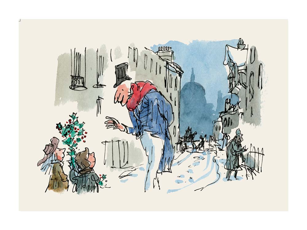 Sir Quentin Blake, one of Britain’s most beloved artists, created the drawings shown here for an illustrated edition of A Christmas Carol, published by Pavilion Books in 1995. Reviewers celebrated the artist's “boundless imaginative energy,” noting his gift for letting characters leap and dance from the page.
