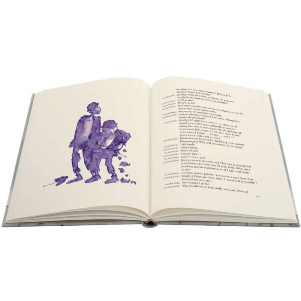 In an edition that showcases the work of two brilliantly dark humourists, Britain’s greatest living illustrator is matched with one of the great plays of the 20th century. Newly commissioned for this extraordinary Folio edition, Quentin's illustrations depict the interaction between Estragon, Vladimir and the sparse cast of other characters as they wait for the elusive Godot. Using only shades of purple, his poignant illustrations in watercolour marker echo Beckett’s genius for stripping the setting and protagonists bare of all context, while also demonstrating humour and perhaps a glimpse of a latent humanity. Quentin has also designed the binding – a symbolic lone tree – while his lettering on the blocked slipcase is at once chaotic and elemental. This remarkable fusion of the work of two formidable creative talents has resulted in a unique collector’s edition that will be enjoyed for generations to come.