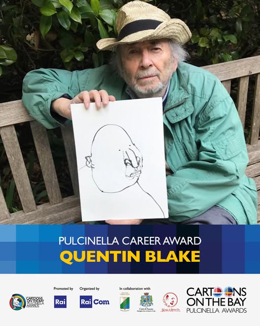 Quentin is delighted to have been named as the winner of the 'Career Award', in particular for his contribution to the animated series 'Quentin Blake's Box of Treasures' which was aired on the BBC in 2024-2025. It was created by a highly-skilled international team of animators, headed by Eaglet Films, who themselves win the Pulcinella for 'Studio of the Year'.