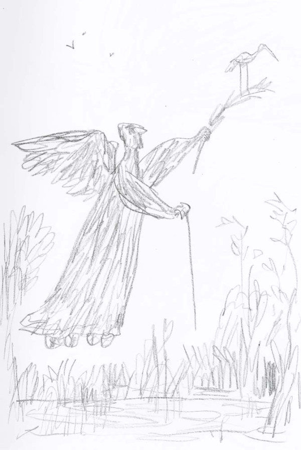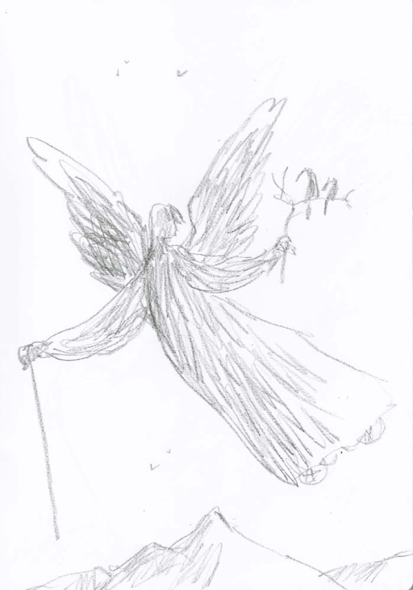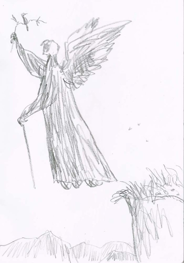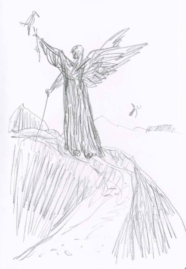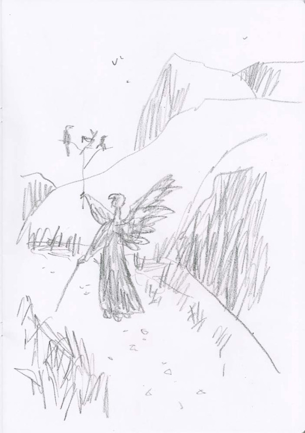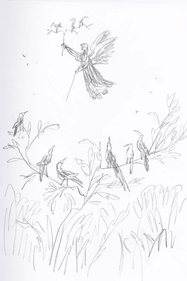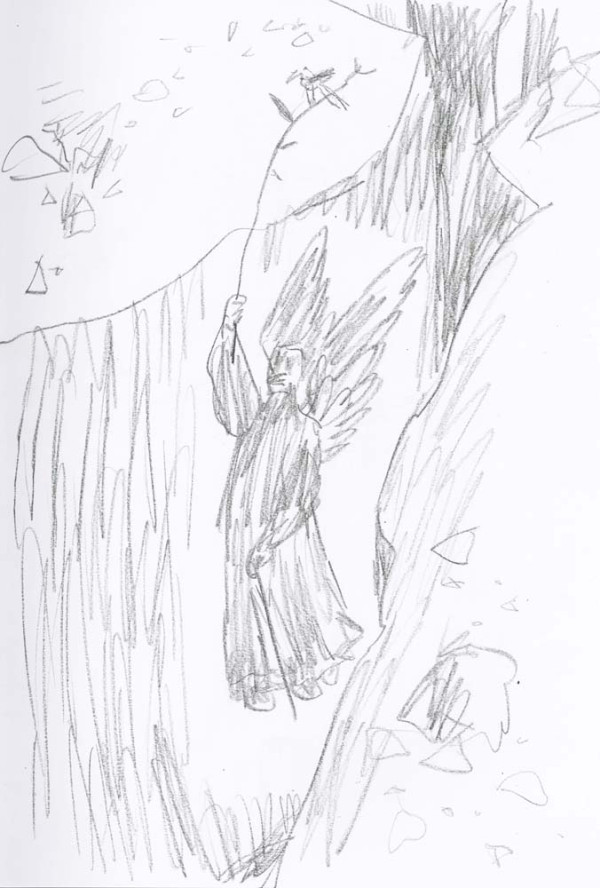I am always in favour of wings – they are enjoyable to draw and they mean that you can have the person or creature anywhere on the page. It’s more lively and interesting if you don’t have to draw a stepladder. Our angel with wings also seems to have wheels and if he has one there seems no reason why he would not have the other. They are just wheels, not roller skates. I suppose I liked the idea of two different, contrasting forms of movement; I cannot explain why you would want the use of wheels if you had got wings already. My plan is to look at the drawings again at leisure and maybe I shall come upon the explanation. - Quentin Blake, August 2019