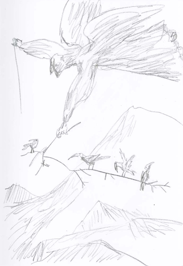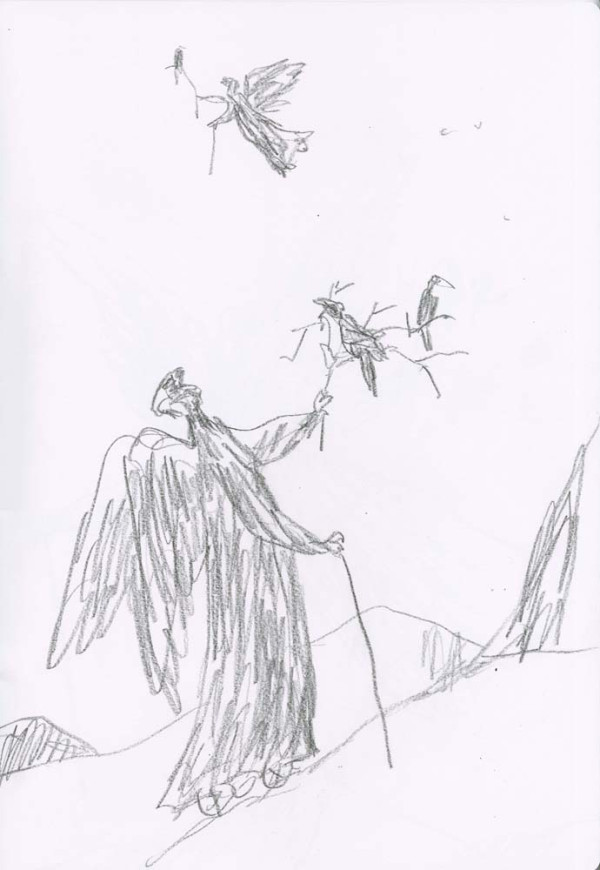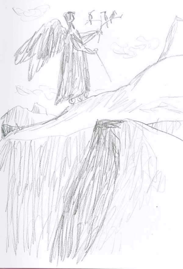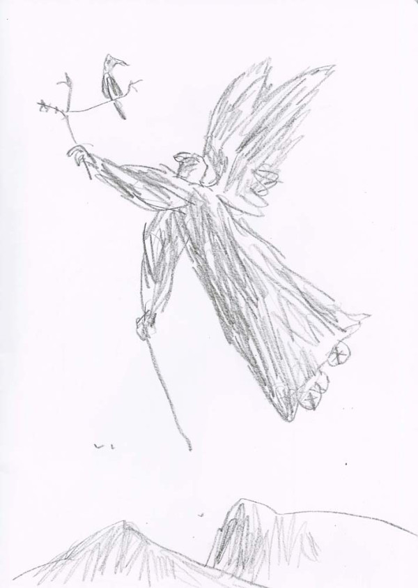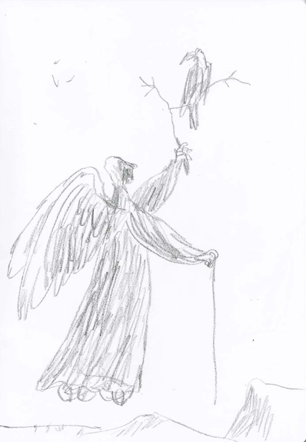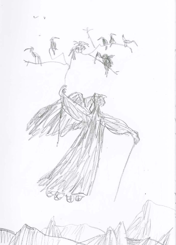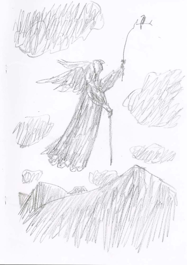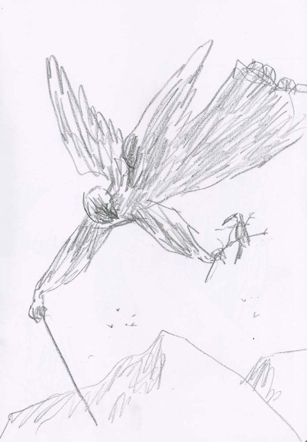 I am always in favour of wings – they are enjoyable to draw and they mean that you can have the person or creature anywhere on the page. It’s more lively and interesting if you don’t have to draw a stepladder. Our angel with wings also seems to have wheels and if he has one there seems no reason why he would not have the other. They are just wheels, not roller skates. I suppose I liked the idea of two different, contrasting forms of movement; I cannot explain why you would want the use of wheels if you had got wings already. My plan is to look at the drawings again at leisure and maybe I shall come upon the explanation. - Quentin Blake, August 2019