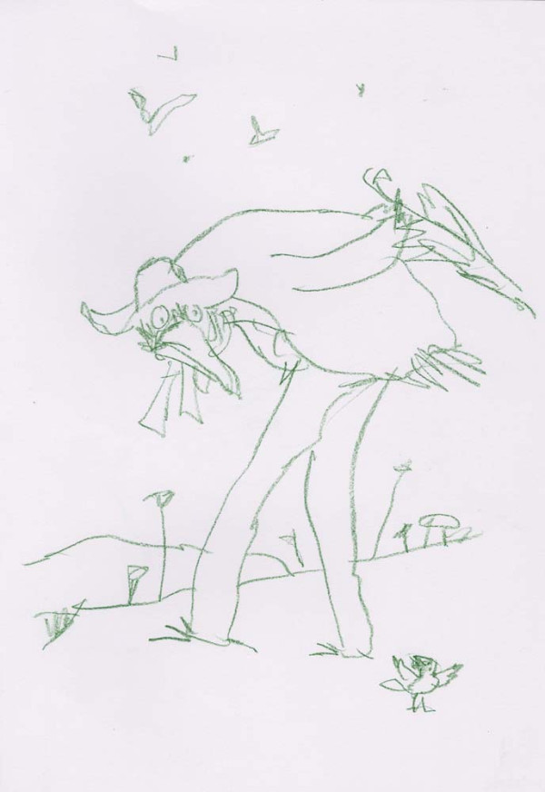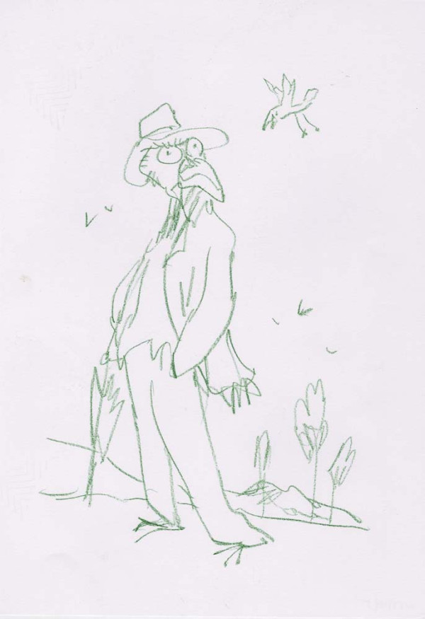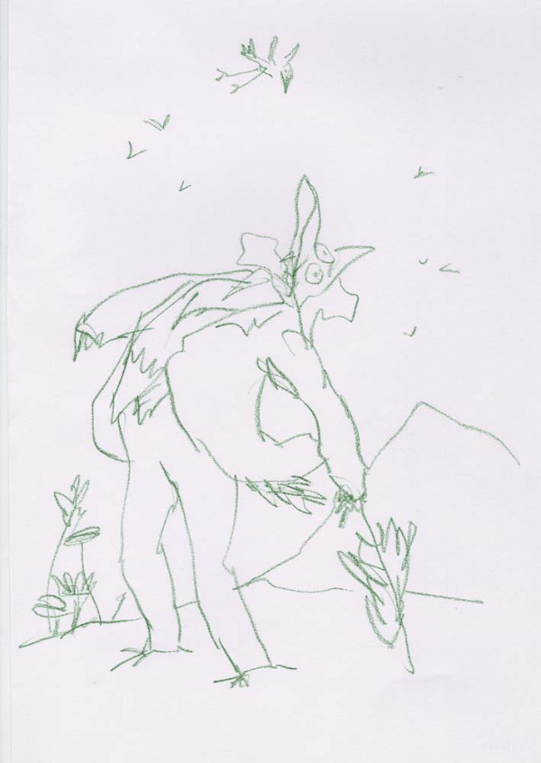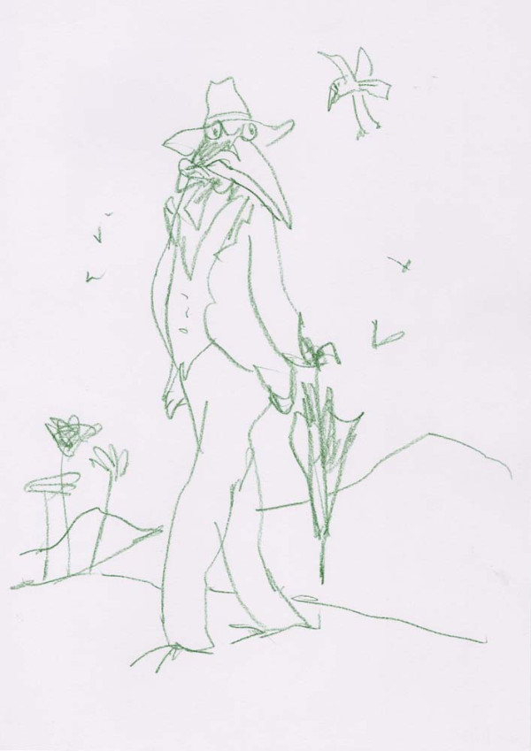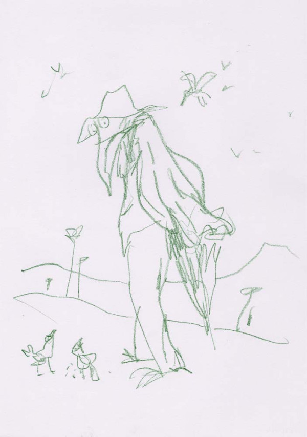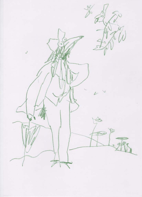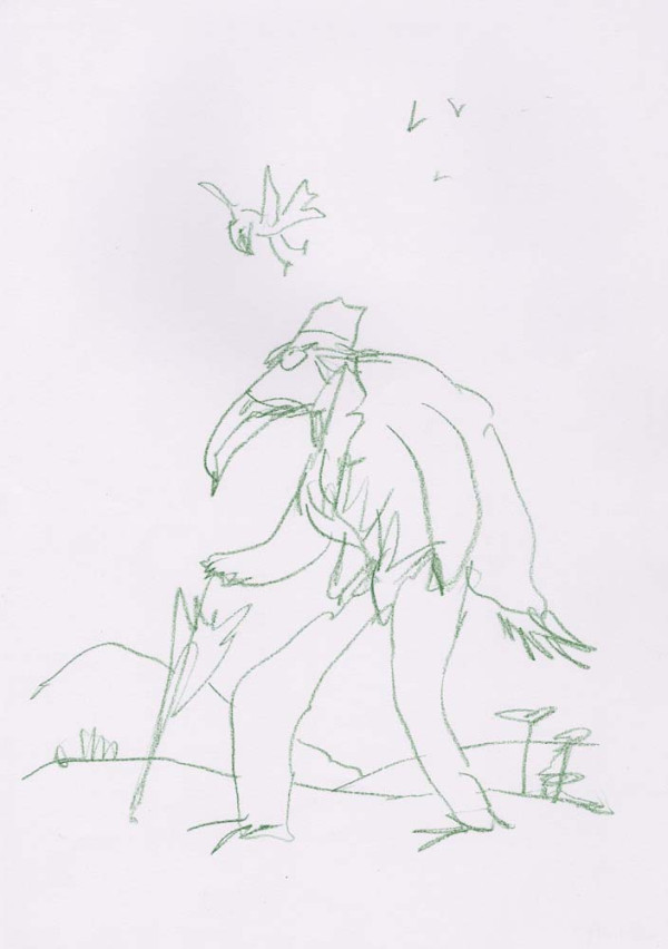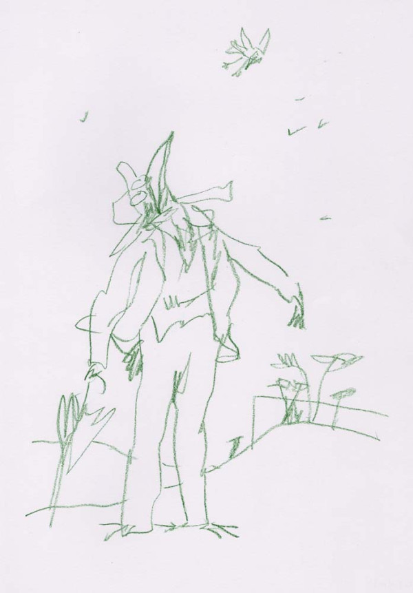 Representing people as birds is a familiar theme in Quentin's work, skillfully captured in these line drawings created in green chinagraph pencil in an A3 drawing book.