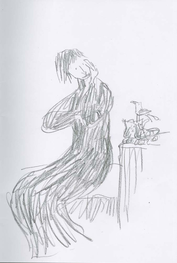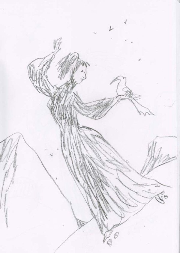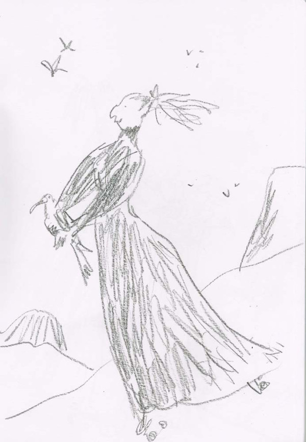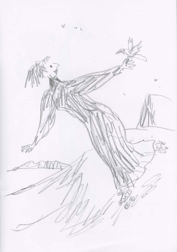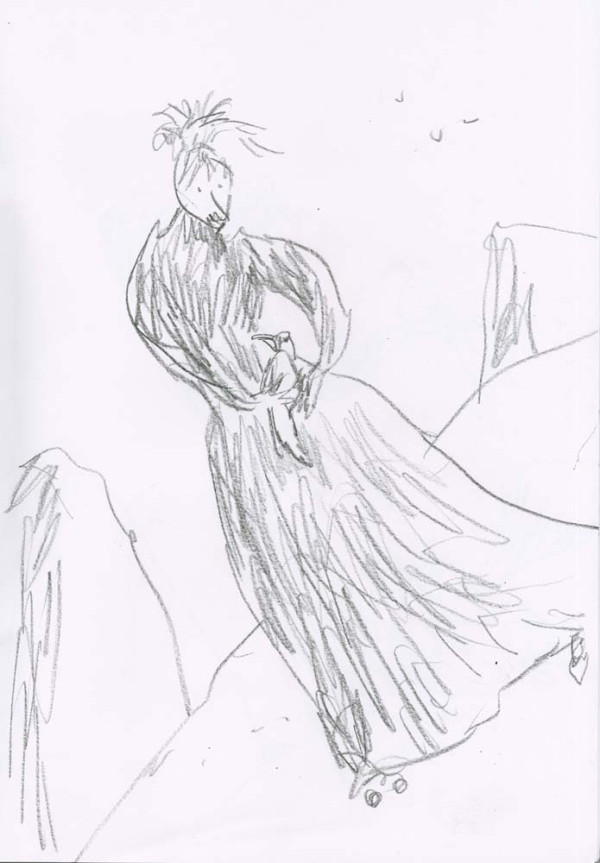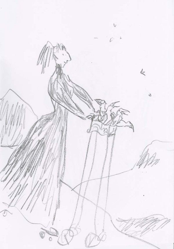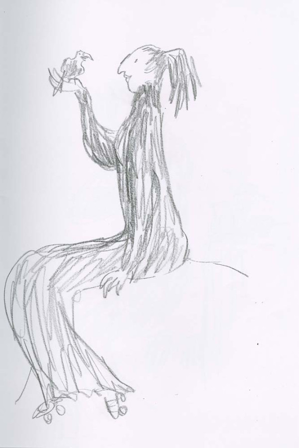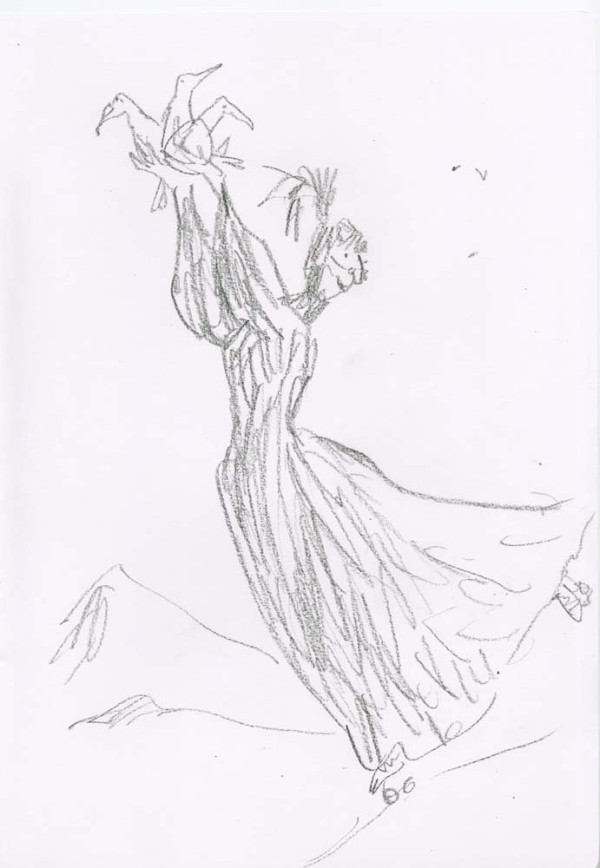 These active ladies in Edwardian dress (each with a bird companion or two) whizzed off the page in May 2019. Created in black chinagraph pencil in an A3 drawing book.