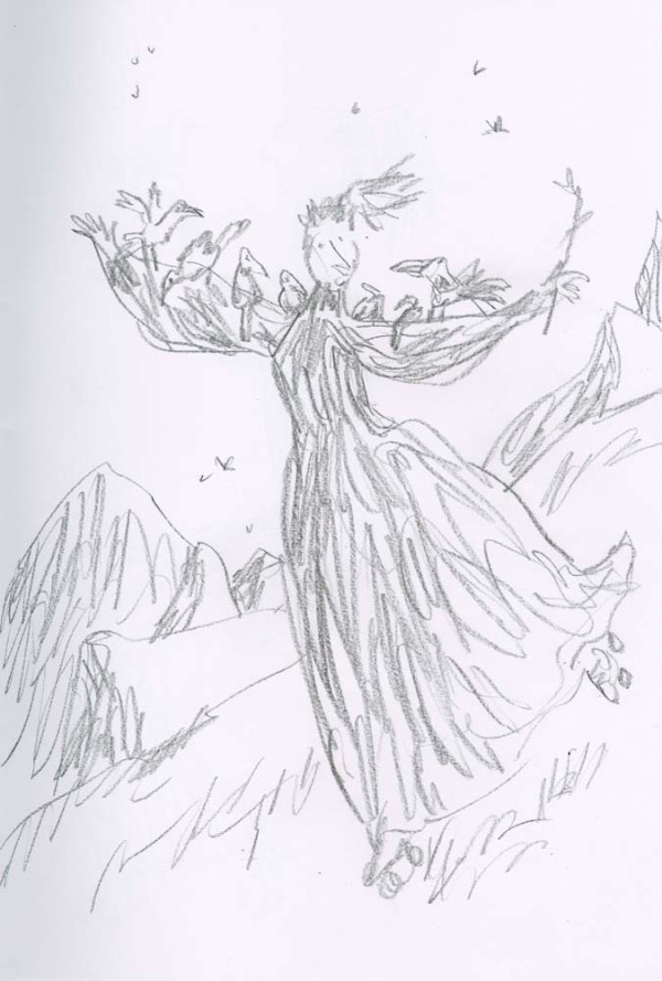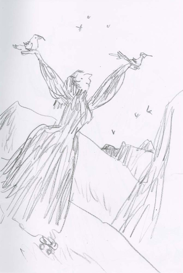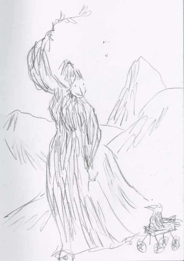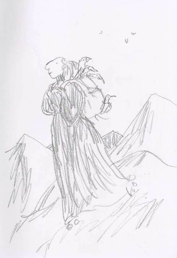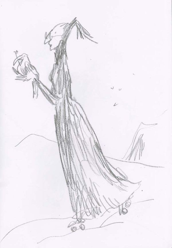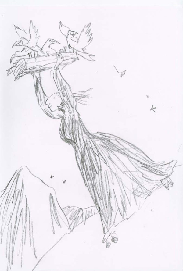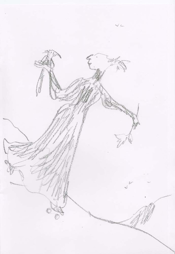 These active ladies in Edwardian dress (each with a bird companion or two) whizzed off the page in May 2019. Created in black chinagraph pencil in an A3 drawing book.