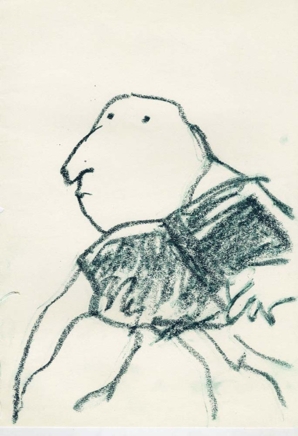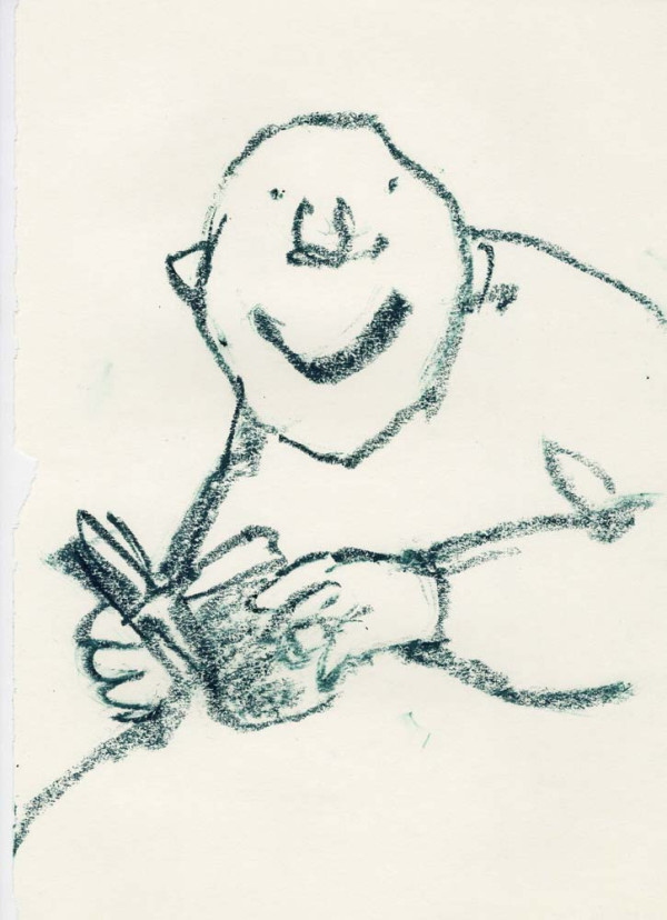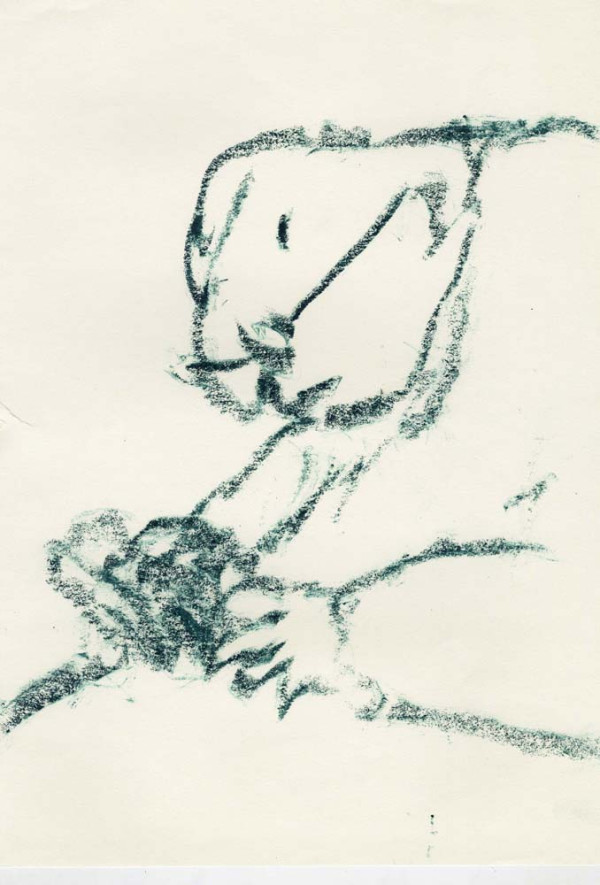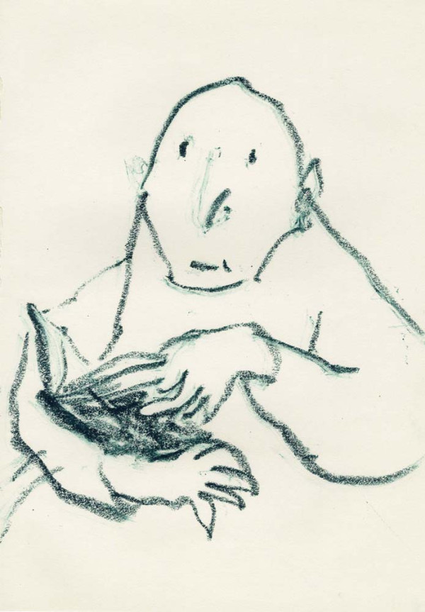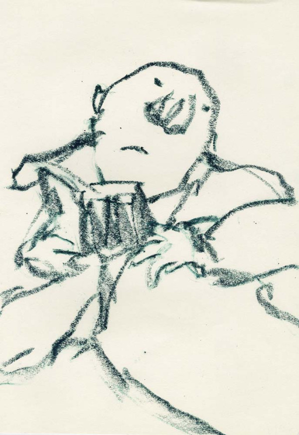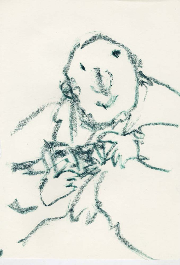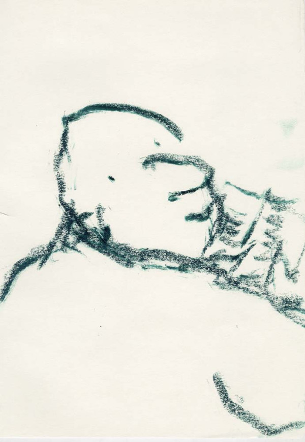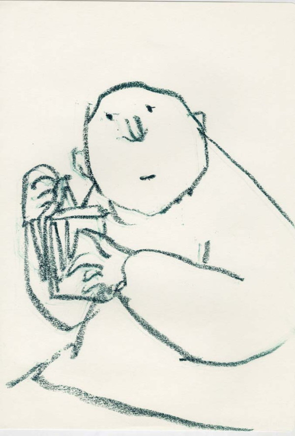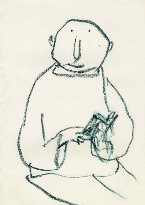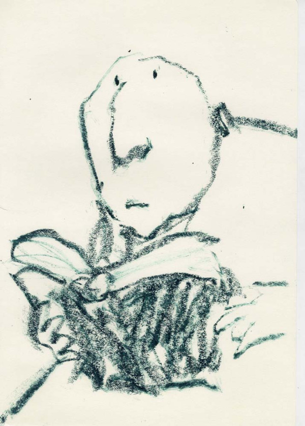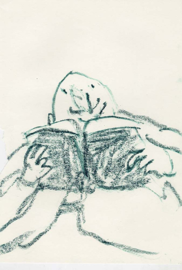 These simple line drawings of people disturbed while reading were created using a dark green oil pastel.