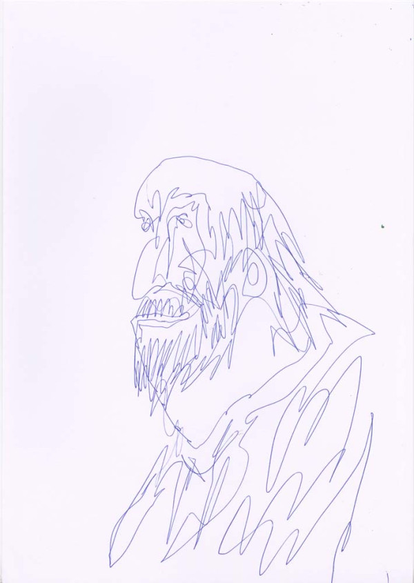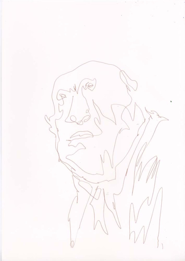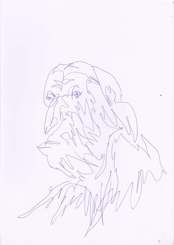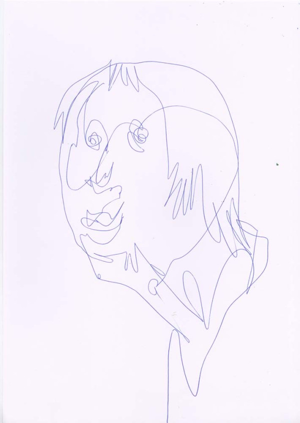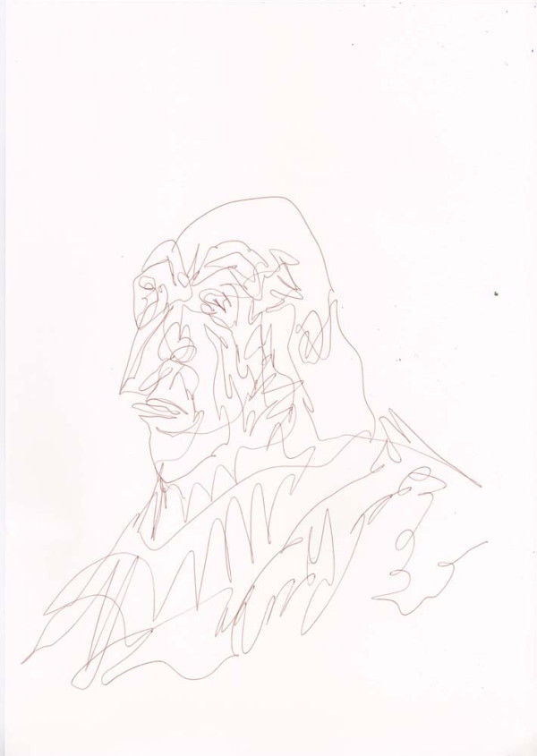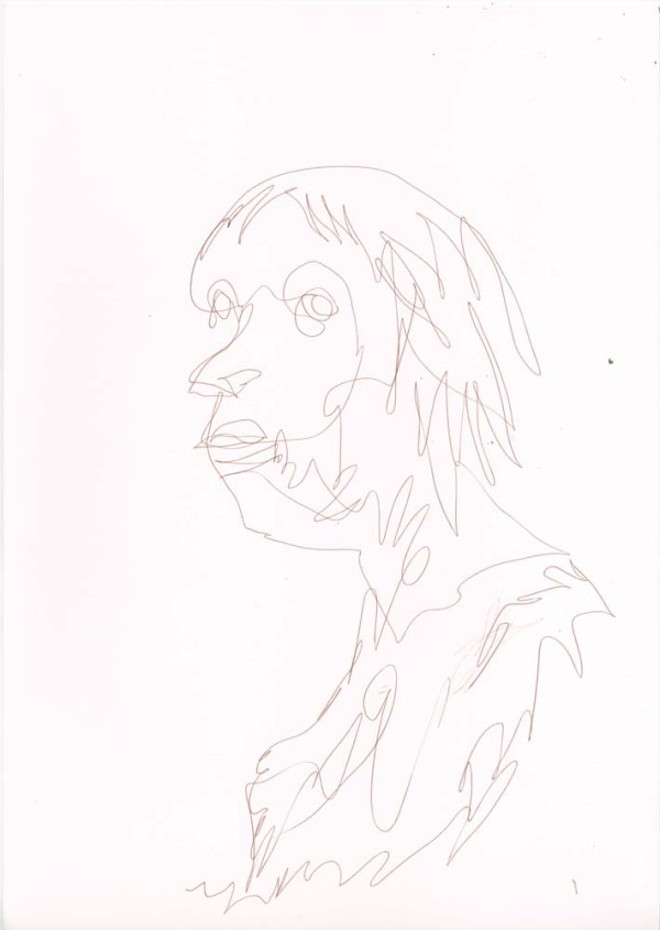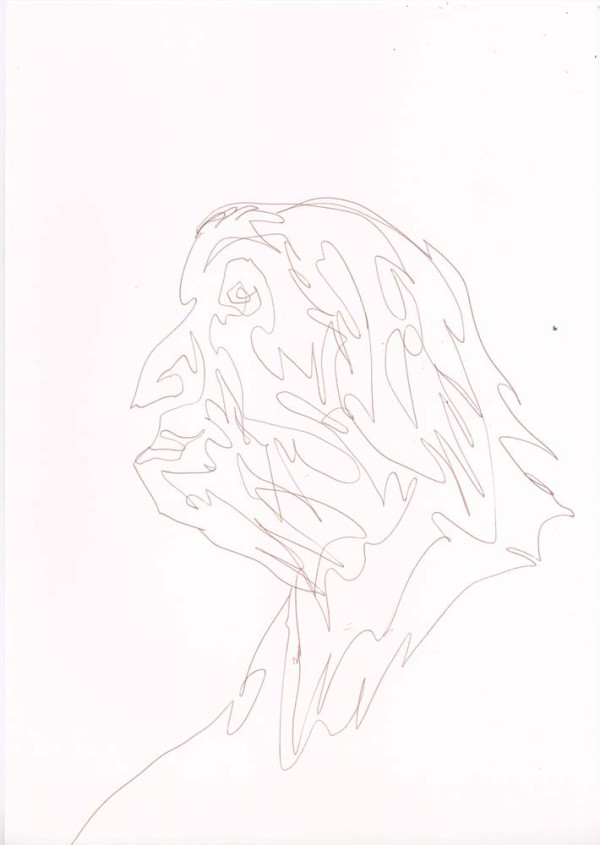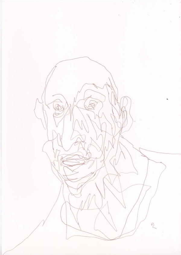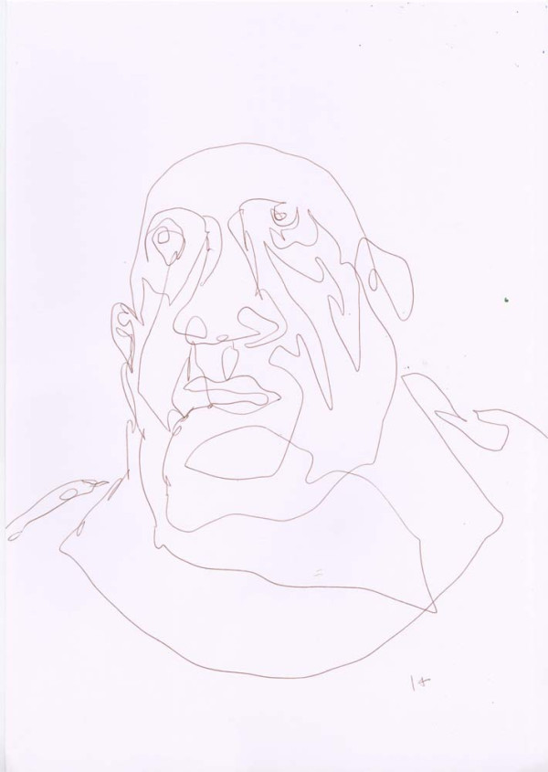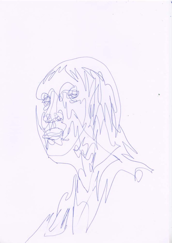 A series of imaginary portraits from 2021, drawn using a ballpoint pen but only one (or two) continuous lines to create the whole. Produced in an A3 drawing book.