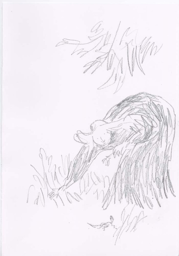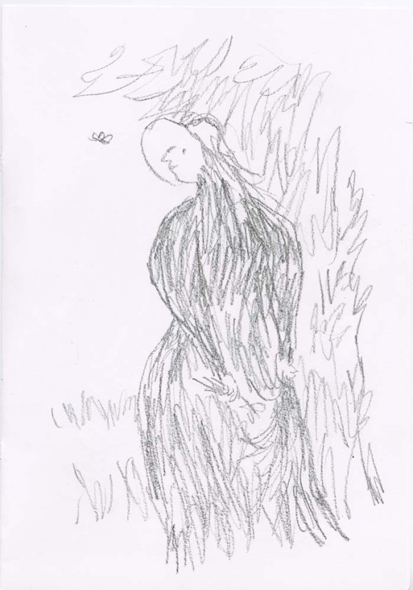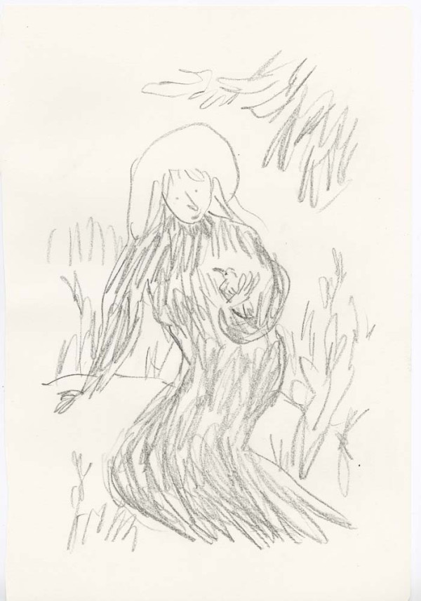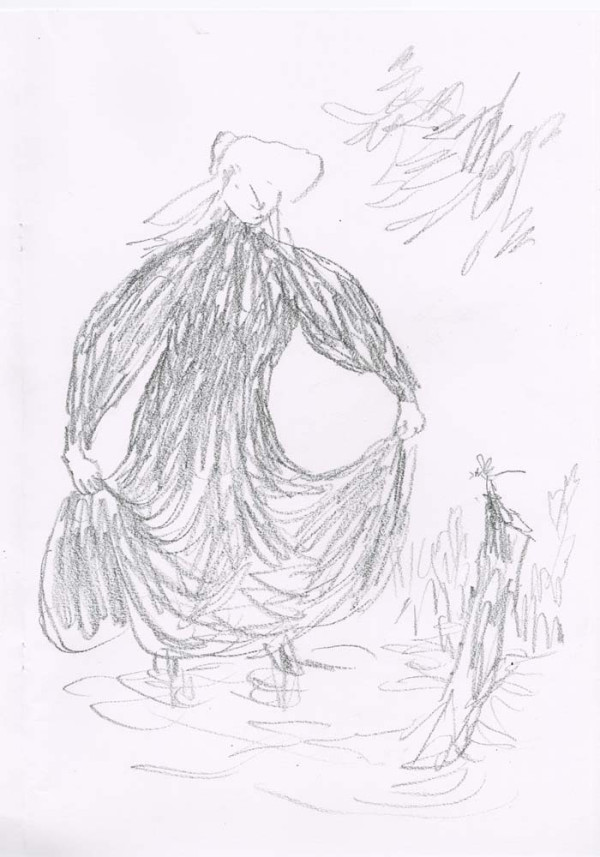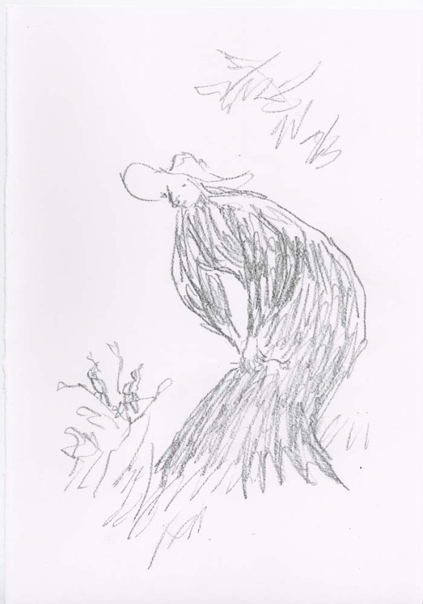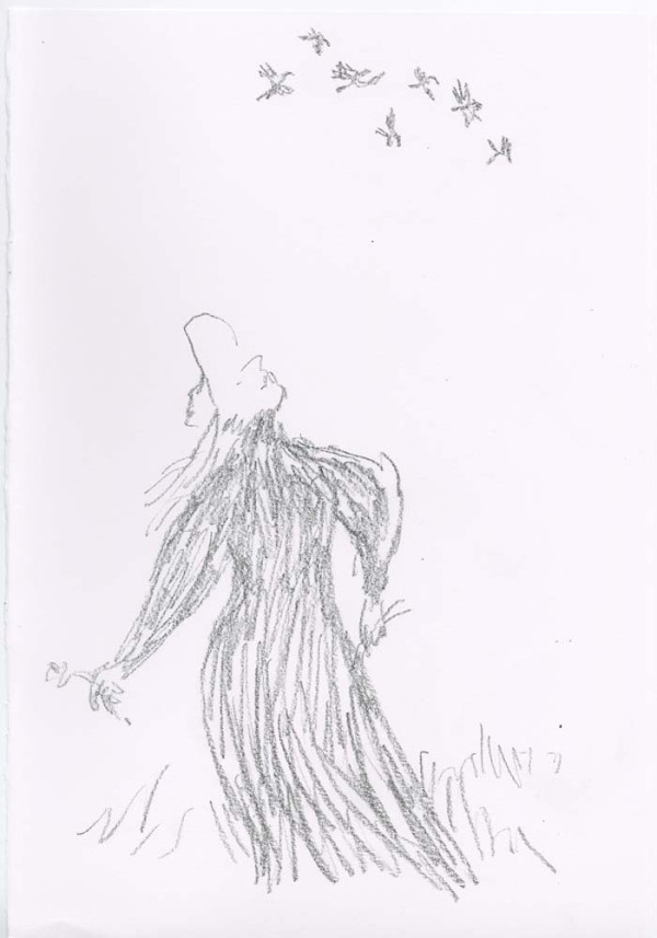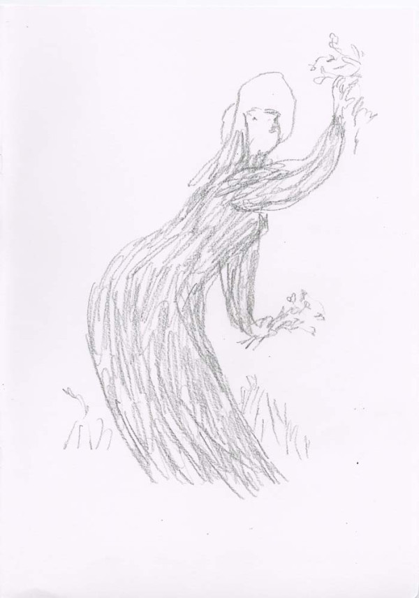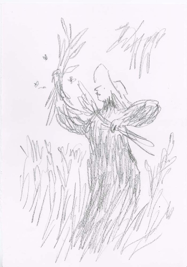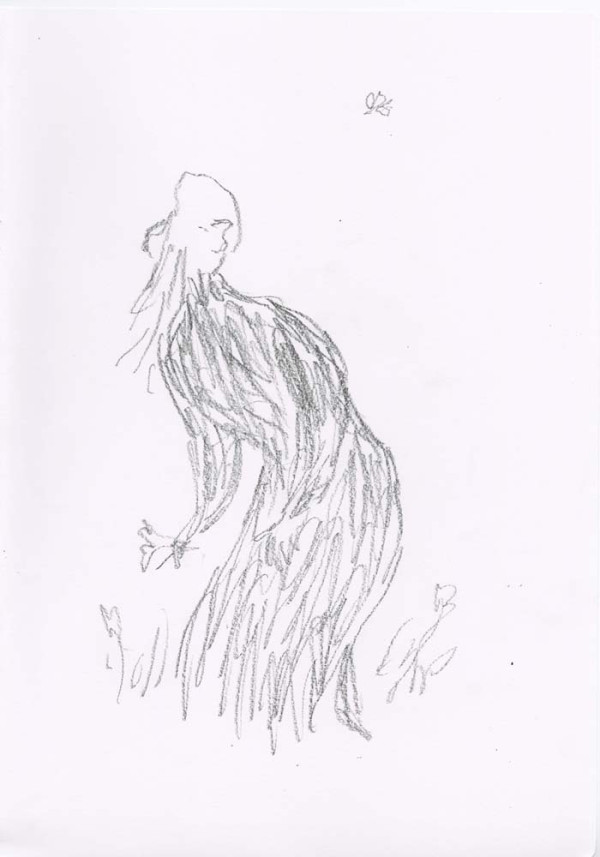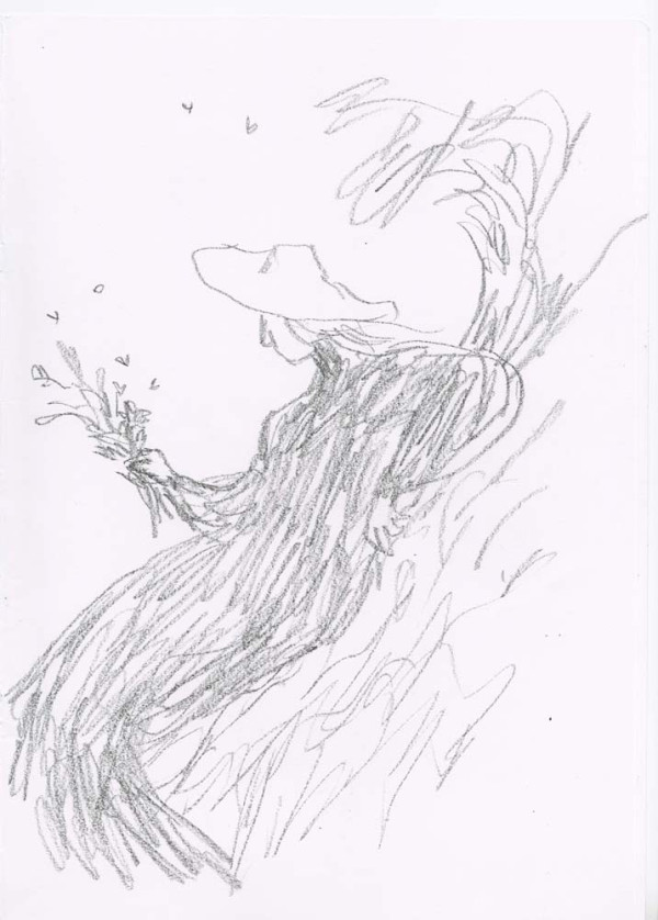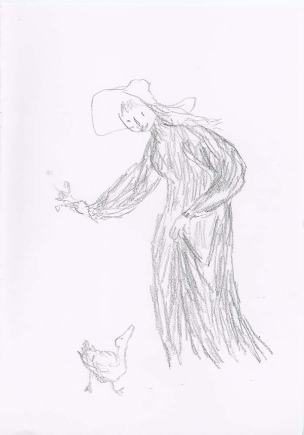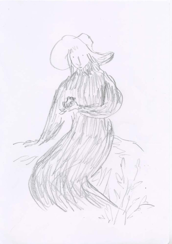 ' I very much enjoy drawing what I persuade myself is an Edwardian dress. The ladies I have drawn are usually pursuing domestic acticities - they are passionate about potted plants - but this time I wanted them to be younger and more relaxed, so I hope the straw hat provides an invitation to the pleasures of outdoors, ones in which I hope the spectator is able to join. - Quentin Blake, June 2019