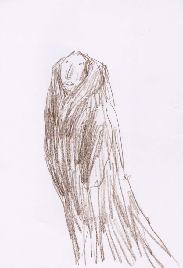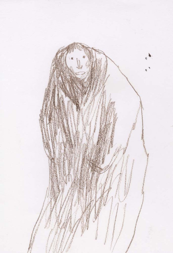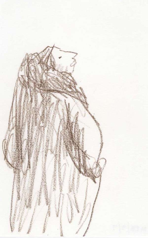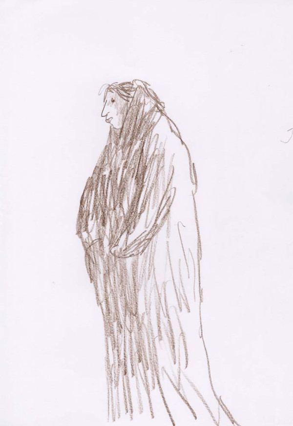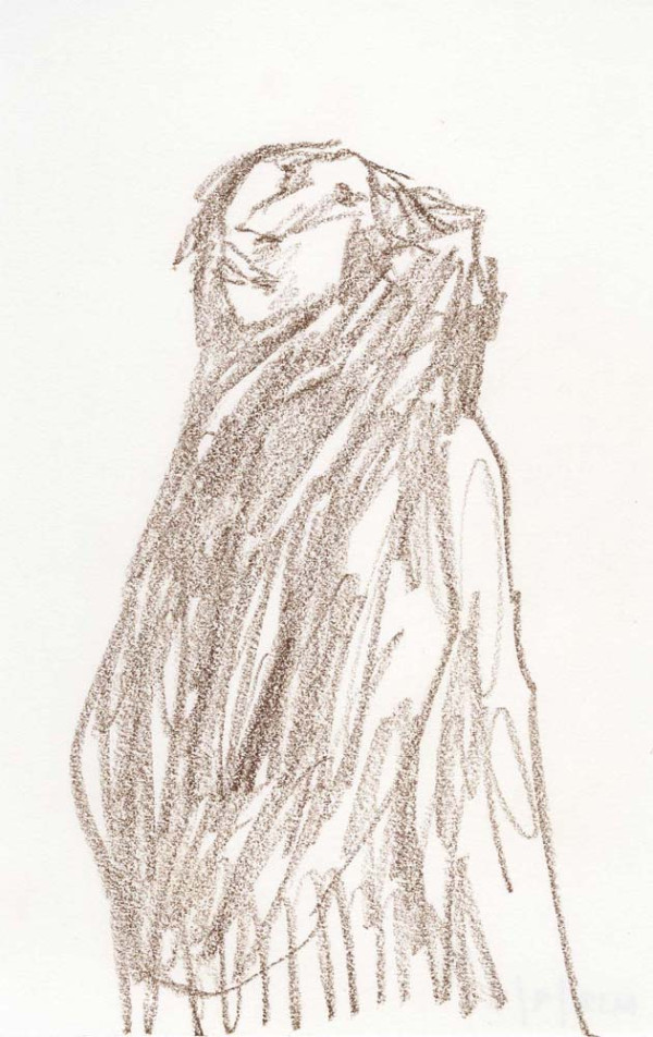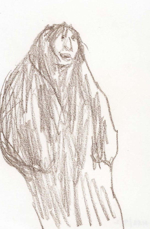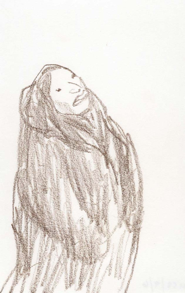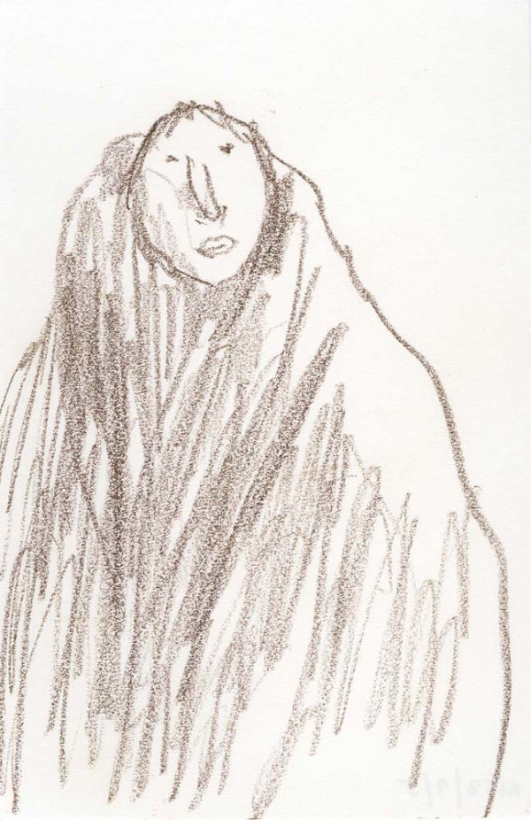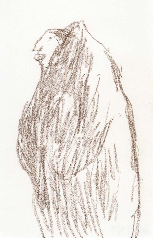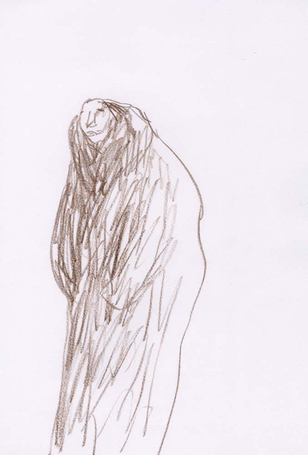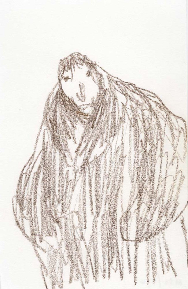 Drawn on 'the hottest day of the year' in June 2020 - as an antidote to the heat - these fur-coated women were produced using a brown chinagraph pencil on paper taken from two different drawing books.