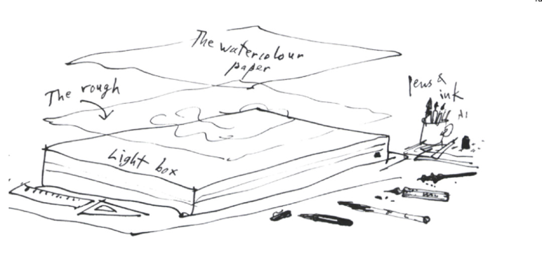 Une série de dessins requiert encore plus de planification, et il faut penser à plusieurs questions en même temps, ce qui fait en partie l’intérêt de ce travail : la méthode et le medium du dessin conviennent-ils à l’atmosphère du livre ? Quel dessin va sur quelle page ? Les actions se poursuivent-elles d’une image à l’autre ? Les personnages gardent-ils la même apparence sur toutes les pages ? Afin que le dessin puisse bénéficier de cette phase de préparation tout en conservant un air de spontanéité, j’ai essayé de nombreuses techniques, dont la plus efficace selon moi, celle que j’utilise depuis une trentaine d’années, est la technique de la boîte lumineuse.