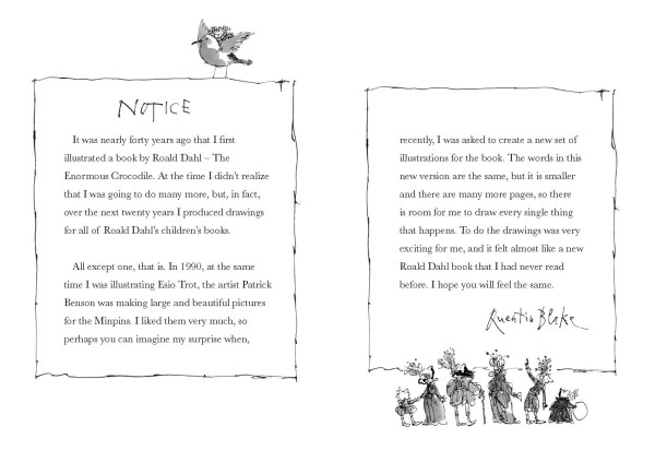 Roald Dahl's final book for children has been re-imagined by Quentin Blake, Dahl's principal illustrator, more than 25 years after it was first published. The original edition, from 1991, was filled with beautiful full-colour pages by illustrator Patrick Benson. The 2017 edition is in complete contrast: a different (pocket-sized) format, many more black & white illustrations, and a text which - though unaltered from Dahl's original - is divided into chapters, giving a different pace to the story.