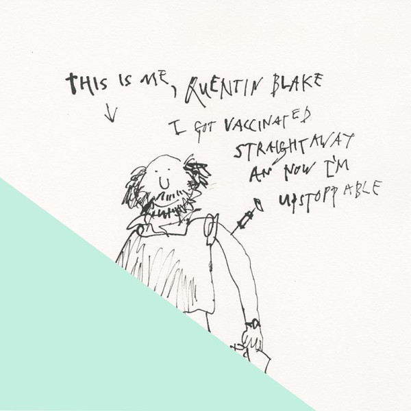 Children across Cambridgeshire and Norfolk NHS Trusts are being helped through their Covid vaccines by two new colouring sheets devised by Quentin Blake. At the request of Dr Peter Rowan, who is acting as a volunteer vaccinator, Quentin drew the two images: one showing both him and Peter 'who is also good at vaccinating people', and the other showing Quentin himself getting a Covid jab.