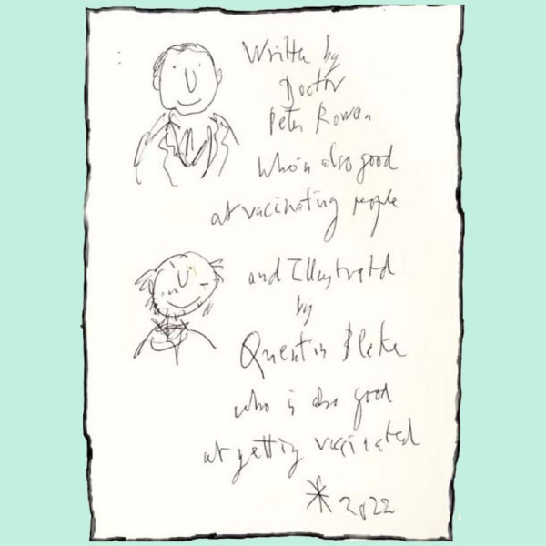 The second illustration, which features both Quentin and Dr Rowan, was drawn in the front of a copy of 'Ask Doctor Pete', the children's book written by GP Peter Rowan in 1986 and illustrated by Quentin, offering interesting medical facts and answering questions that children ask such as: Does eating bread crusts make your hair curl? and ‘My Mum and Dad always make me wash my hands after going to the toilet. Is this a waste of time?’ The book has also subsequently been published under the title, 'Can You Get Warts From Touching Toads?'